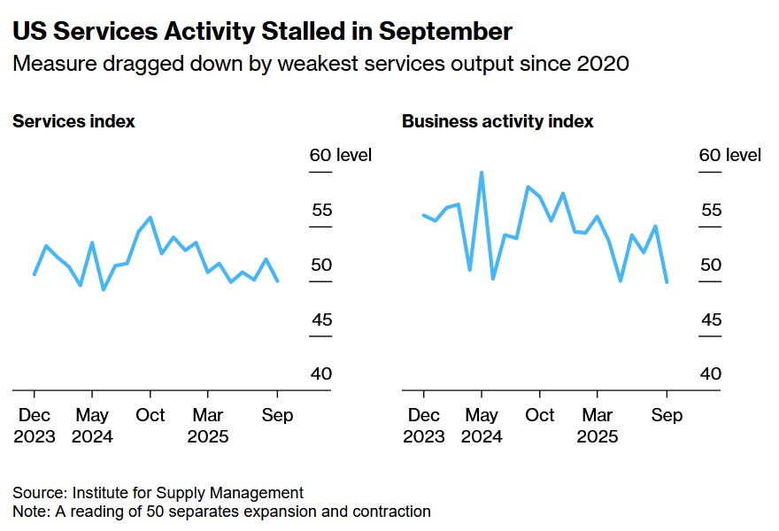 上週五,美國供應管理協會(ISM)公布的最新數據顯示,美國9月ISM非製造業指數降至50,遠低於市場預期的51.7與前值52。由於50為景氣榮枯分水嶺,該數據意味著美國服務業活動在9月幾乎陷入停滯。根據報告,訂單與商業活動同步降溫,就業指數更是連續第四個月萎縮。