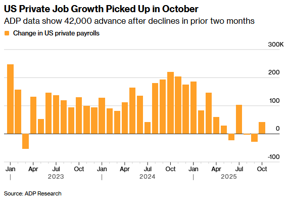 美國自動數據處理公司(ADP)昨日公布的最新報告顯示,10月份美國ADP就業人數增加4.2萬人,明顯高於市場預期的3萬人,同時也扭轉了上月修正後減少2.9萬人的局面。