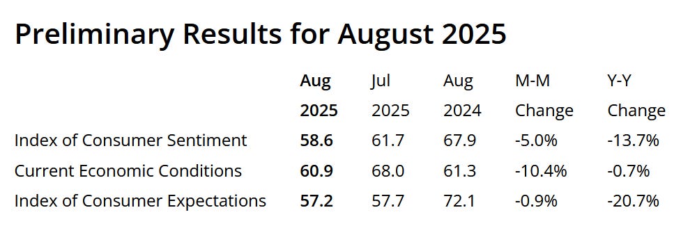 然而,在零售數據公布後不久,密歇根大學的調查卻顯示,美國消費者信心於8月初意外下滑。該校公佈的初步報告指出,消費者信心指數降至58.6,明顯低於市場預期的62與前值61.7,結束自4月以來的上行趨勢。分項數據顯示,