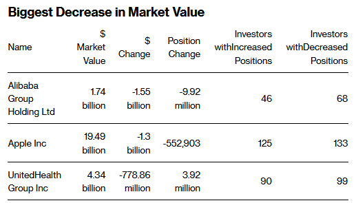 與此同時,中概股阿里巴巴成為最大規模的減倉標的,基金合計持倉價值下降15.5億美元。其中,橋水拋售566萬股,Coatue Management減持293萬股。