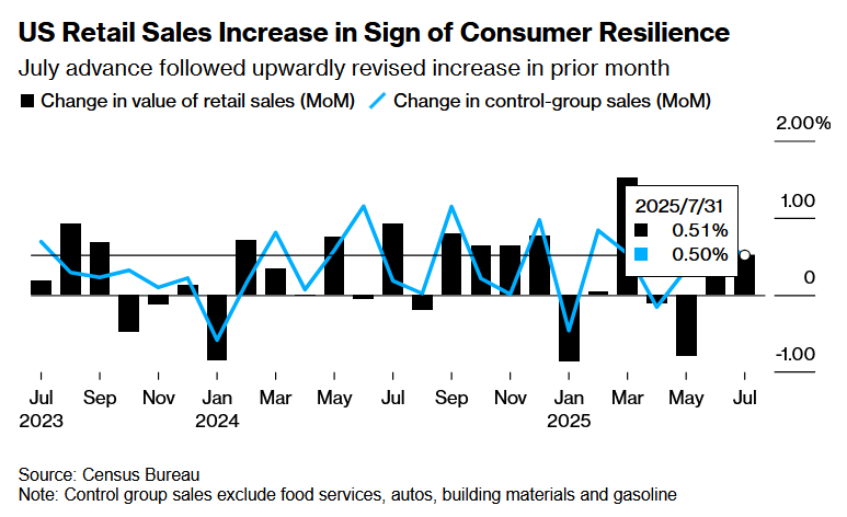 1. 美國7月零售銷售顯示消費者仍在購買,但消費者信心意外轉弱