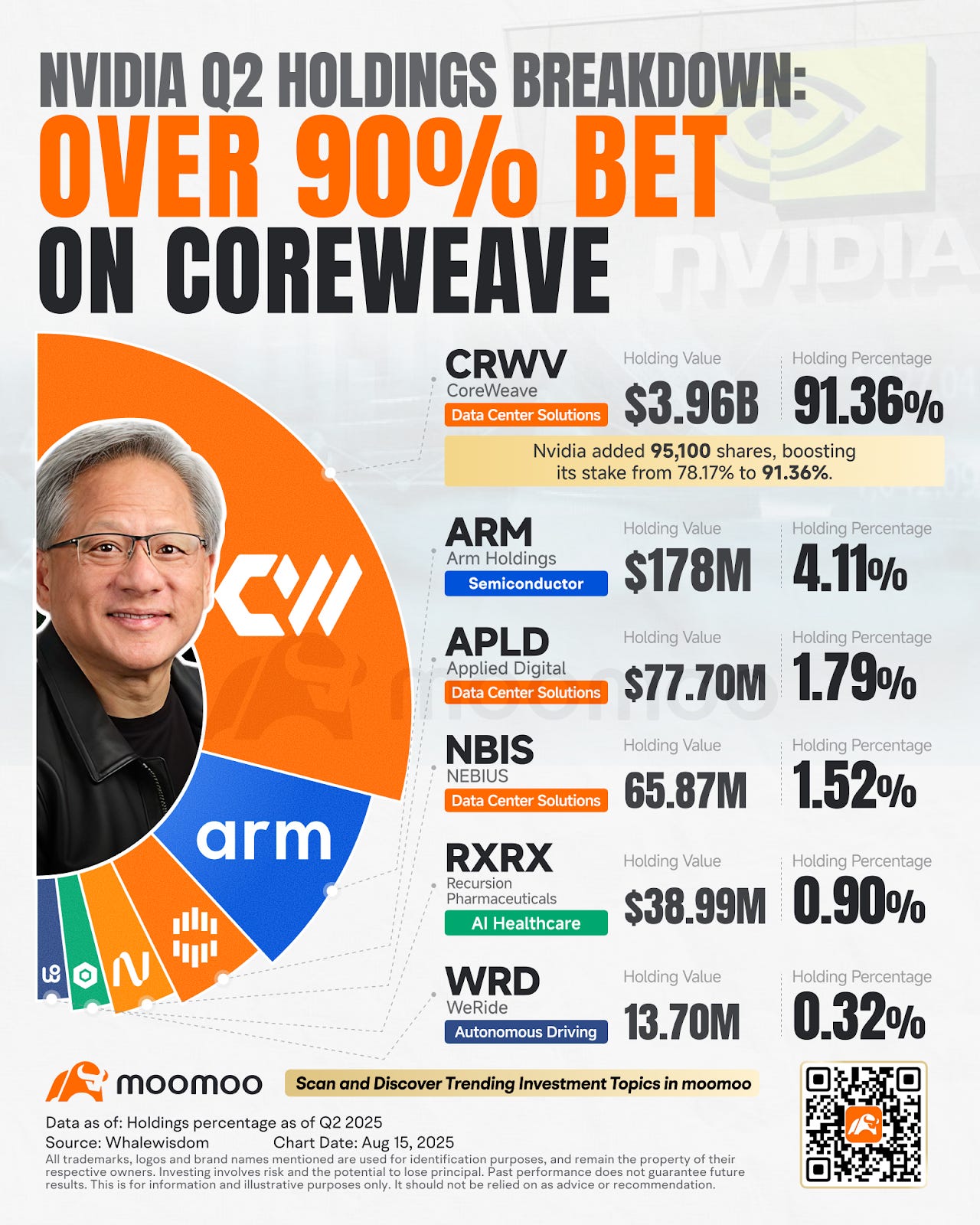 值得一提的是,根據英偉達最新提交的13F文件,截至6月30日,英偉達將其91.36%的公開持倉集中投資於CoreWeave,總額达$3.96億美元。雖然在CoreWeave總市值約488.4億美元的體量下,英偉達持股比例仍不算高,但作為核心戰略投資者,其動向對市場信心影響重大。